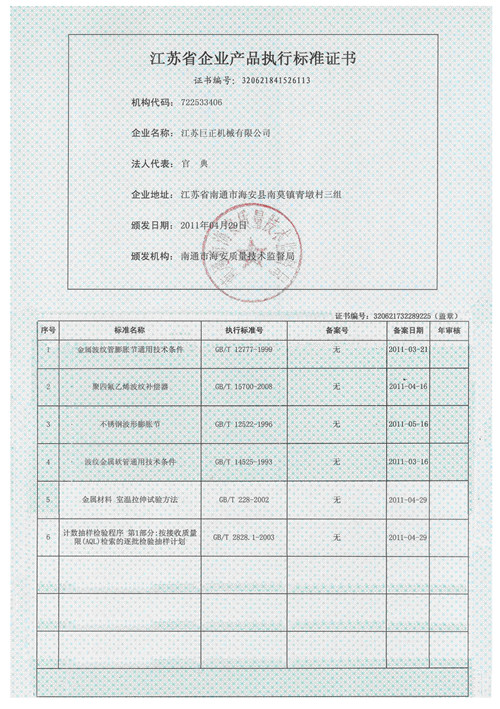 江蘇省企業產品執行標準證書
